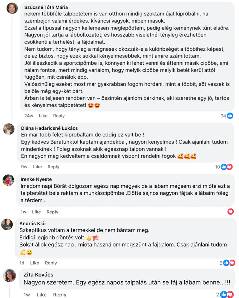 "A mágnesek finom masszázst adnak minden lépésnél, az akupresszúrás pontok pedig kellemesen enyhítik a lábfájdalmat és a feszültséget. Azóta nem csak a lábam érzi magát sokkal jobban, hanem a közérzetem is javult. A fájdalmaim teljesen megszűntek, és végre felszabadultnak érzem magam a hosszú műszakok után."